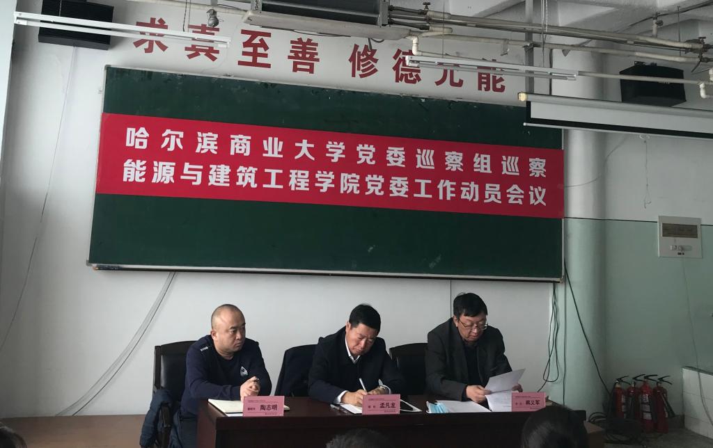 会议第一项,纪检监察处处长陶志明代表哈尔滨商业大学党委第一巡察组向能源与建筑工程学院党委提出中共哈尔滨商业大学委员会关于开展校内第一轮巡察工作方案。巡察工作以习近平新时代中国特色社会主义思想为指导,全面落实党的十九大、十九届二中、三中、四中、五中全会及中央纪委、教育部党组和省委全面从严治党相关会议精神,按照十九届中央纪委三次全会对深化政治巡视作出的重要部署,贯彻省委和省纪委监委的部署要求,强化政治监督,聚焦全面从严治党,突出政治纪律和政治规矩,全面加强党风廉政建设,保障党的路线方针政策和学校决策部署的贯彻执行。