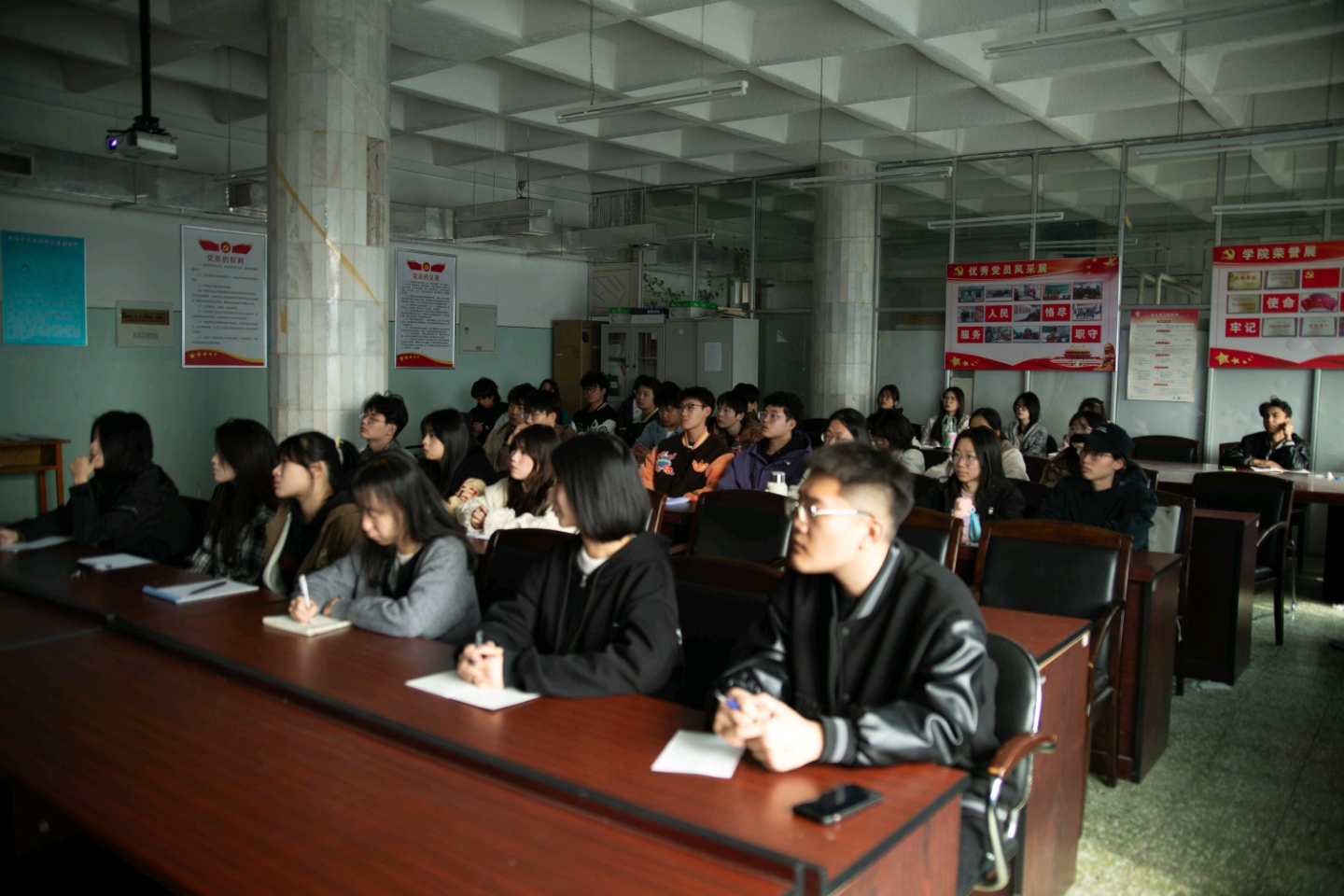 代文竹老师为我们指明了新媒体中心学生干部这一角色的责任以及定位。作为学生干部就是起一个“承上启下”的作用,是具有学生身份的特殊的领导者和管理者,强调了对于学生干部的选拔标准必须品学兼优,德才兼备。同时也强调学生干部必须以身作责,积极帮扶学弟学妹们在新媒体部门中找到合适的定位,提高部门成员的工作能力及效率,团结起来共同为新媒体中心的发展而努力。代文竹老师指最根本也是最重要的一个原则:活动主题必须坚定正确的政治方向。参会人员认真听会并做详细的记录。