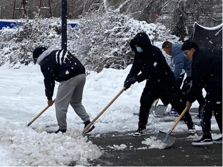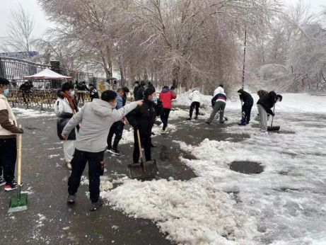 天降寒装冷难着,破甲除冰暖心窝。冬天来了,大雪纷飞,一夜之间,商大的校园银装素裹,分外妖娆,这样的美景虽然令人赞叹不已,但也给师生的安全带来了隐患。为了方便大家出行,维护大家正常的生活秩序,能建学院开展“扫雪”行动,11月9日中午12点30分21级辅导员张浩老师带着同学们拿起铁锹、扫帚等除雪工具,以班级的形式划分责任区域进行扫雪除冰的行动。