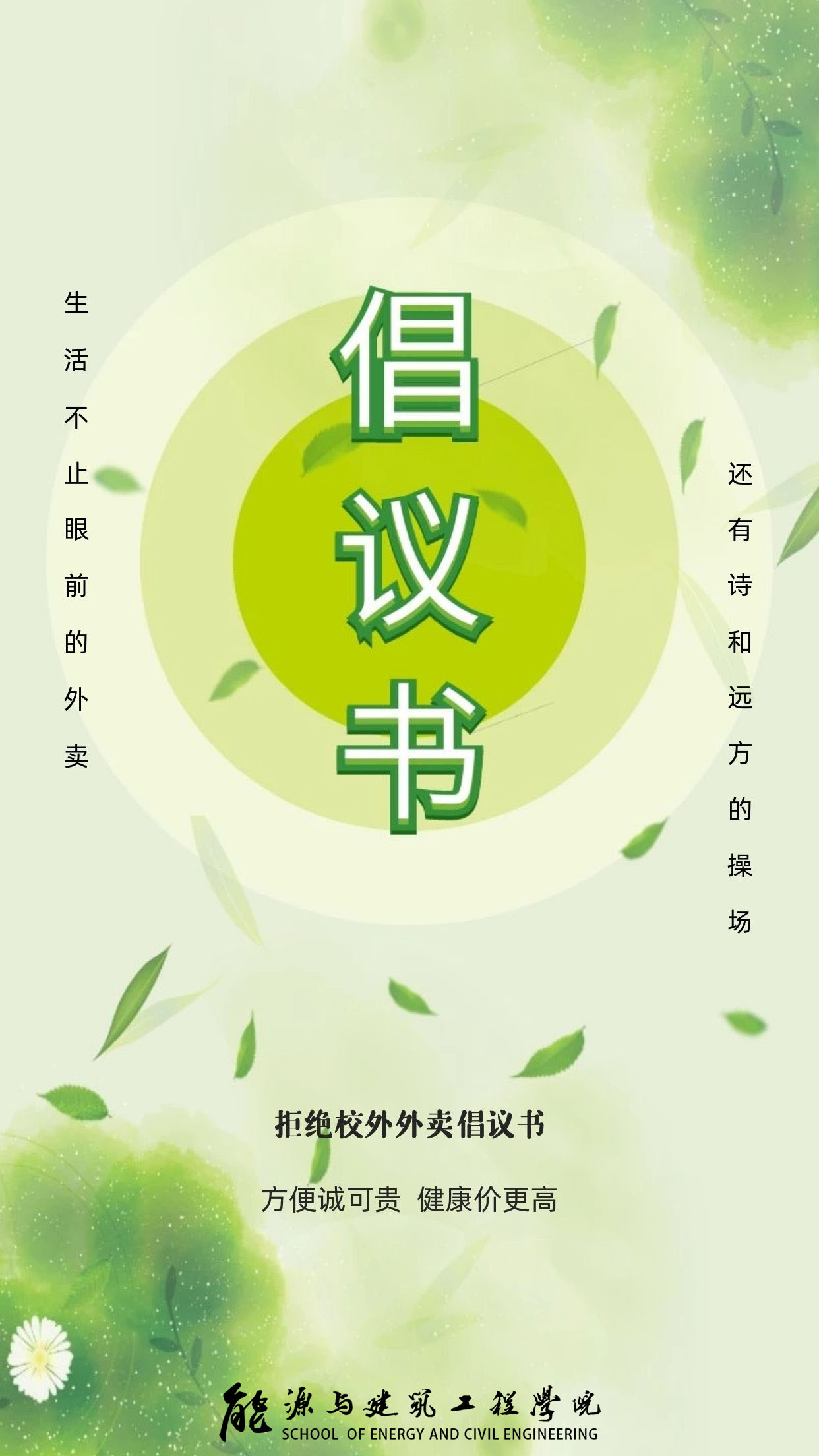 特别在当前疫情防控常态化的校园中,外卖带来的隐患也许会让学校全体师生全力防控的良好局面功亏一篑。为营造良好的校园环境,创建和谐美丽校园,需要广大同学的共同努力。因此,现向全能建同学发出如下倡议: