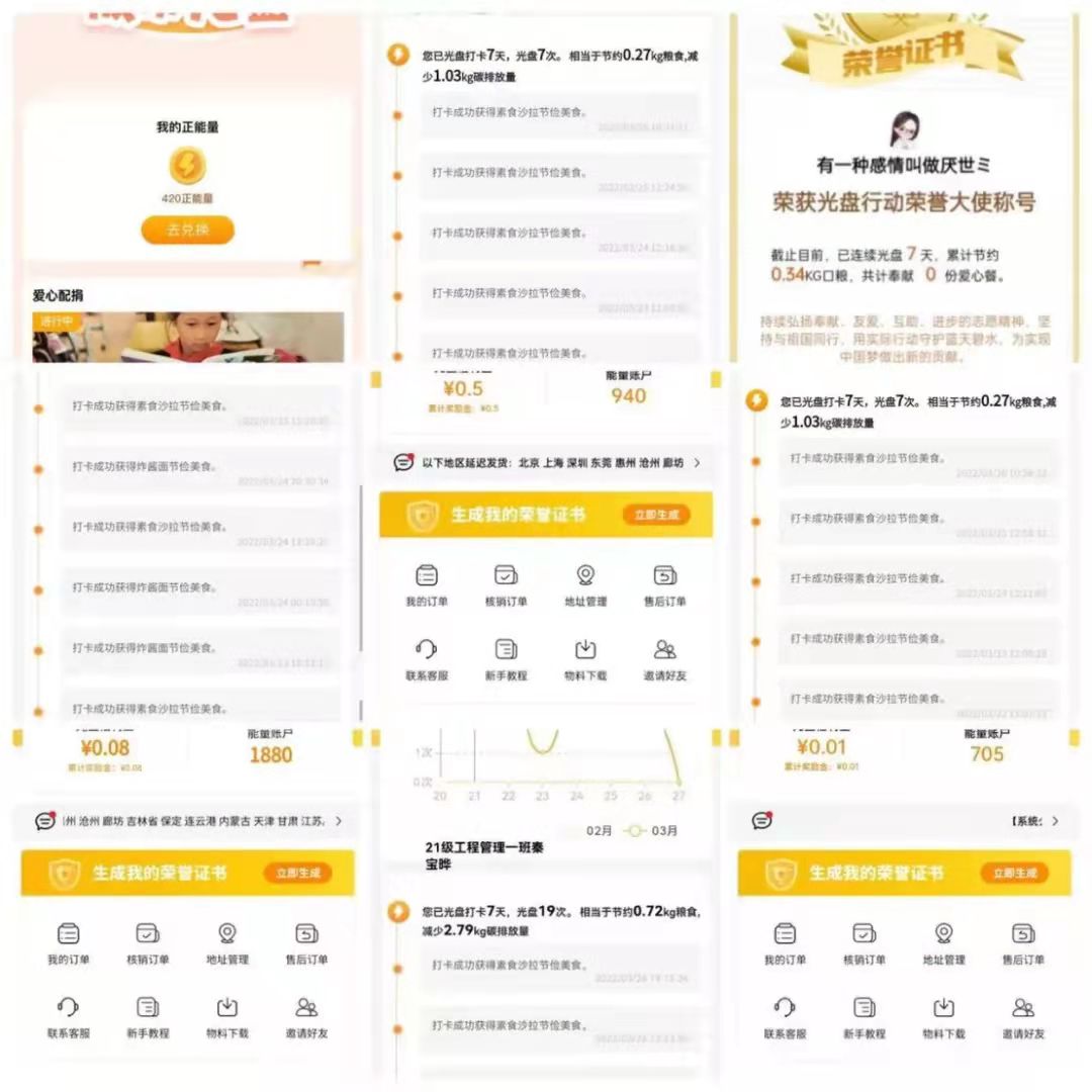 本次活动采用“光盘打卡”微信小程序进行光盘打卡。每日用餐完毕后,同学们在小程序进行打卡,打卡次数的每一次积累都相当于节约的一部分粮食,减少一部分的碳排放量,同时也会助力“书海工程”等公益项目,形式虽然简单,但却将珍惜粮食、勤俭节约的美德广而告之。经过大家的坚持,我们的“光盘行动,你我同行”打卡活动也已结束,经工作人员筛选和统计,对坚持7天连续优秀打卡的同学给予表彰。