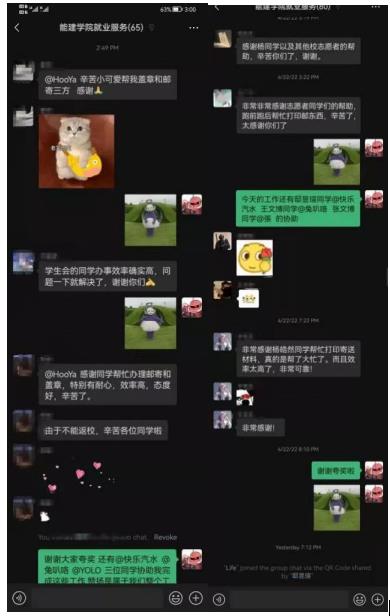 到目前为止,学生会工作人员们已经帮助了18名大四年级同学打印盖章并邮寄就业相关材料。受到帮助的同学们对学生会的工作人员表示了由衷的感谢: