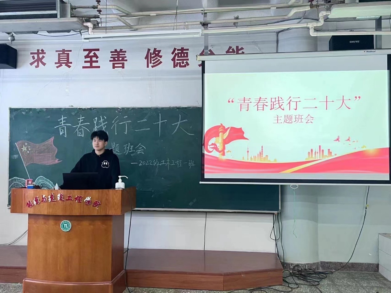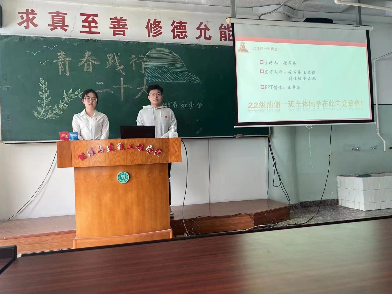 班会开始,赵思明老师指出深入宣传贯彻学习党的二十大精神是当前和今后每个时期的重要任务,告诫同学们应该把握当下,严格要求自己,深入学习二十大精神,争取在大学四年提高自己,早日为国家,为社会做出贡献。2022级建筑环境与能源应用工程一班的杨大坤和王昱涵同学做出了“青春凝聚力量,赢得未来中国”主题演讲,鼓舞同学们充实自己,不负青春,不负韶华。2022级土木工程二班的谢桂涛同学为大家带来了他对党的二十大精神内涵的深刻理解,围绕从爱国,团结,奋斗,科学,互助五个方面,表达了自己对党,对国家的深深热爱和赞美。2022级油气储运工程一班的徐子昂和王梓涵同学,以“实践行动筑梦自强新时代”为主题的演讲,倡导新时代新青年以中华民族伟大复兴为己任,脚踏实地为祖国献出自己的一份力量。