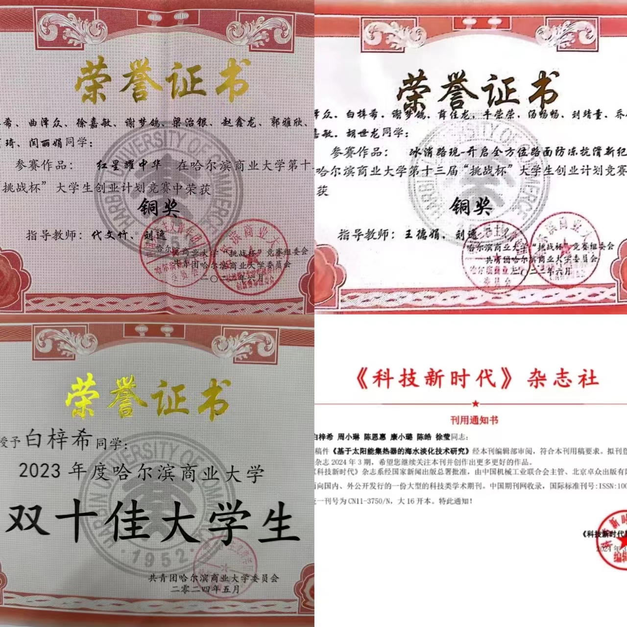人生在勤,不索何获。一份努力换取一份收获,白梓希同学如今的成就从来不是轻松取得,是他通过日日夜夜的奋斗而取得的。白梓希同学对自己有着极高的要求,在学习上,上课时他全神贯注、不愿落下任何一个知识点、课余时间他也会进行自主学习。在竞赛的征途上,付出了无尽的努力和汗水,无数个日夜他熬夜研读,潜心钻研,寻找解决问题的方法。一次次被否认,但他并没有被击垮,而是从中汲取教训、总结经验,不断调整自己的策略和方法。为了完善项目书整日泡在图书馆中查阅资料,不停的向老师请教。每一次的付出,都让他更加坚定走向成功的决心。对于他来说,面临的种种困难和挑战都成为了成功路上的助力和宝贵的经验,让他在面对未来的学习和职业发展时更加从容和自信。