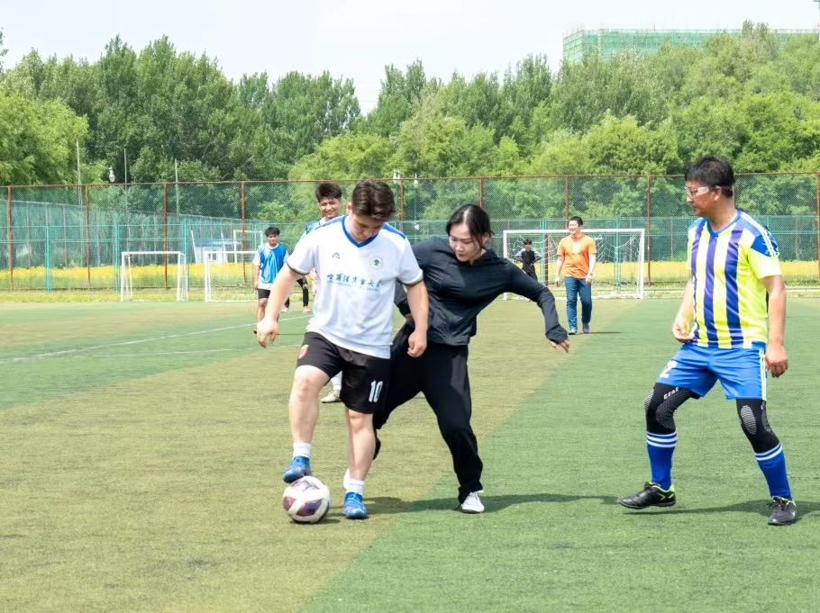 在紧张的氛围中,两队之间展开一场场激烈的角逐,无数精彩瞬间交相辉映,10号球员凭借着过人的技巧,成功突破防线,将球精准地传给孙鸿宇老师。后者一记潇洒的抽射,球如离弦之箭,直飞毕业生队伍球门,赢得全场一片热烈的掌声。侯玮婷老师面对前后包抄的困局,展现出超乎寻常的冷静与沉着,成功突破并将球稳稳送入球门,赢得观众的齐声喝彩。随后,35号球员从超远距离发起攻势,一记大力抽射,球在空中划出一道优美的弧线,成功追回一分,令观众无不惊叹其球技之精湛。他们的呐喊助威声和欢呼声成为了赛场上最美的旋律。比赛结束,教师队以13:4战胜了2020 级毕业生球队。