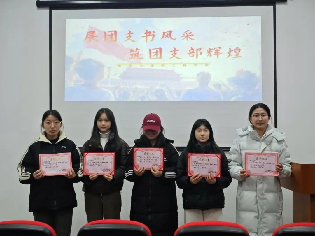 比赛有两个环节组成。第一环节为必答题,第二环节为抢答题。第一环节答题结束,进入中场休息,主持人为各位参赛选手播放红色电影片段,希望同学们从中学习和了解并传承红色革命精神。 各团支部书记在比赛中各有千秋,发挥精彩,各团支书较高的思想道德素养、扎实的团学理论基础、较强的个人业务技能水准,赢得了大家充分肯定。比赛结束,五位团支部书记分别获得奖项。一等奖24级工程管理一班施懿恩,二等奖24级工程管理二班刘安鑫,23级能源与动力工程二班张晴晴,三等奖24级土木工程一班王丽媛,23级油气储运工程一班王婷婷。能源与建筑工程学院侯玮婷老师为五位获奖团支书颁发荣誉证书并合影留念。